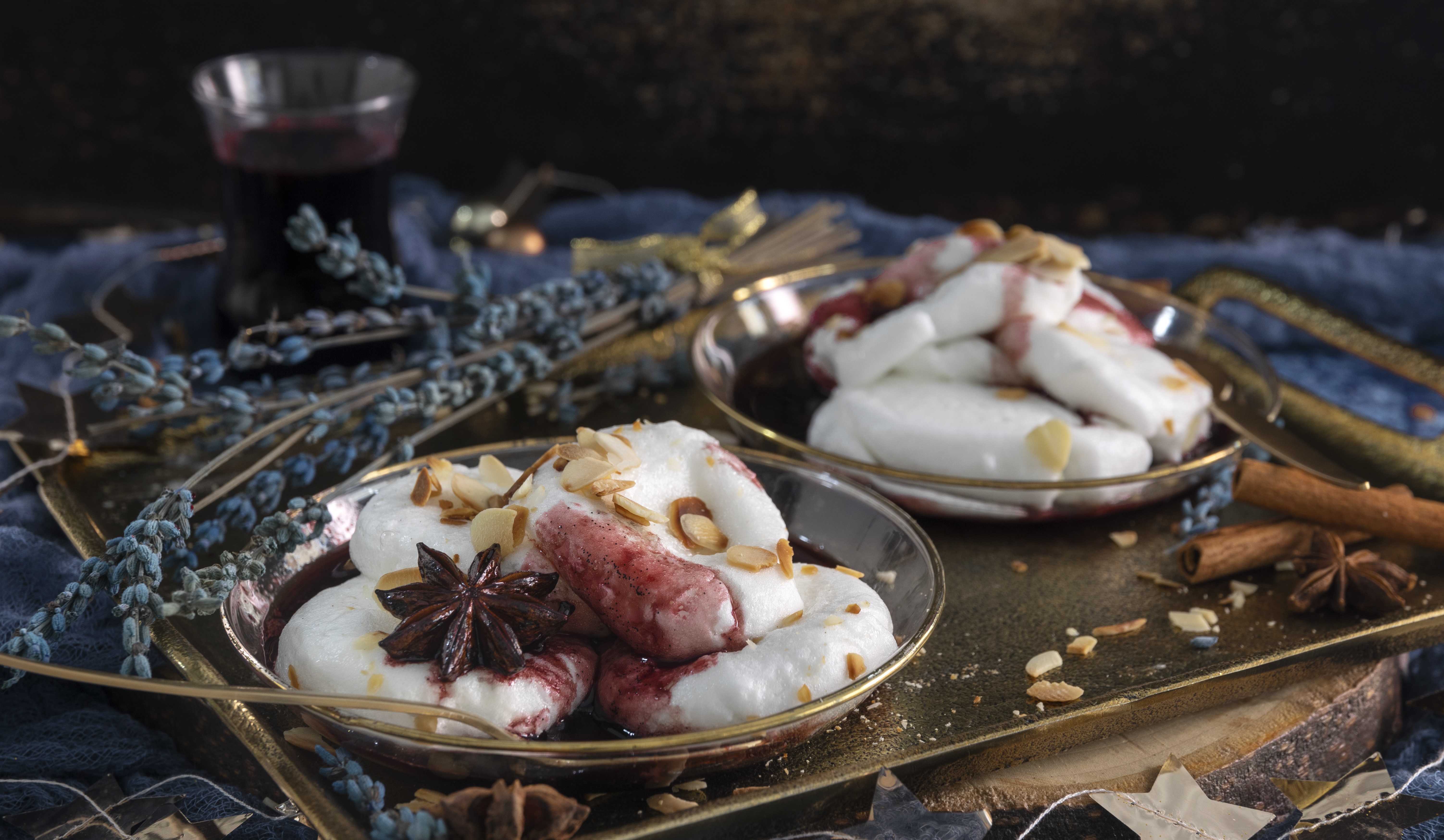 Retire o gengibre e a vagem de baunilha e sirva as farófias com a redução de vinho do Porto.