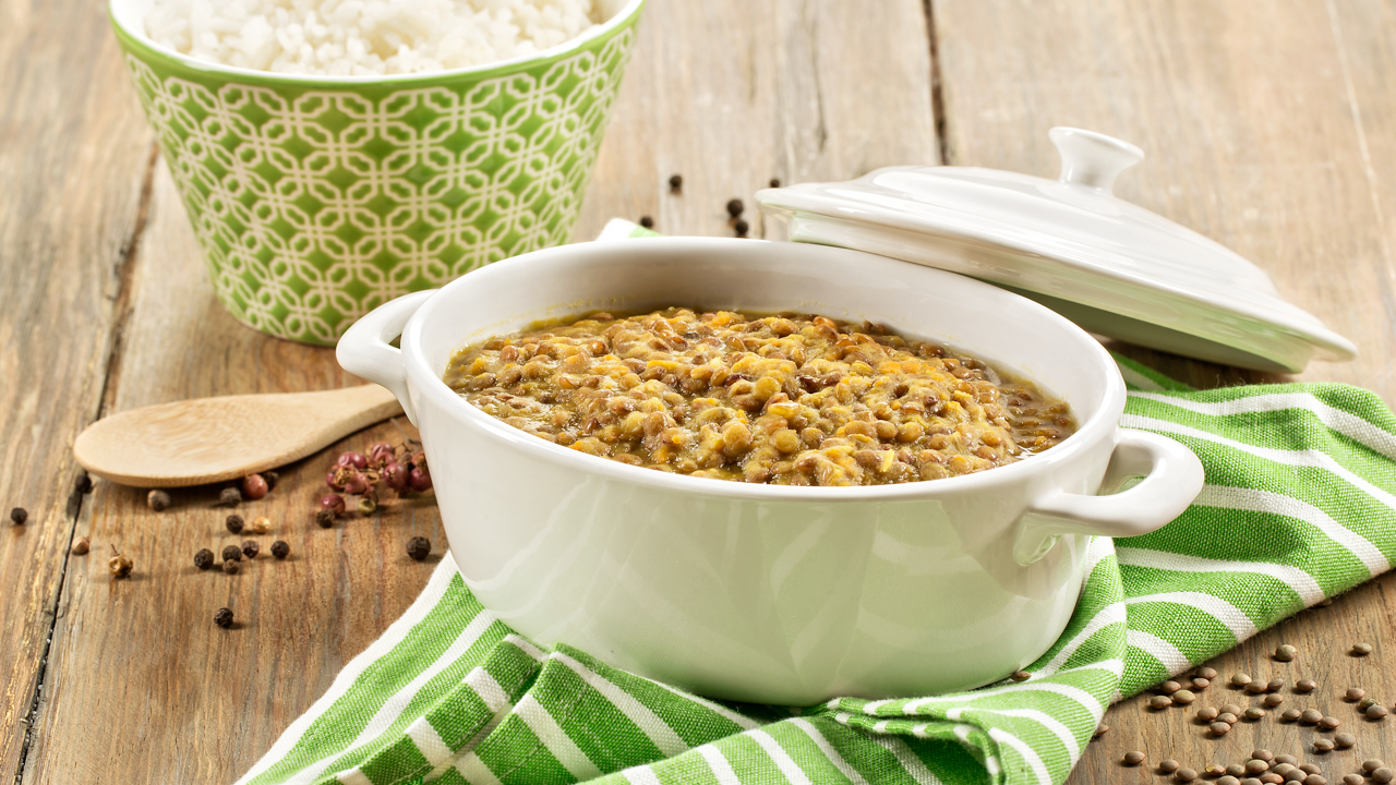 Adicione as lentilhas escorridas, a água e o caldo de legumes e coza 20 minutos, a 100°C, velocidade 1 na Rotação Inversa. Retifique os temperos, se necessário.