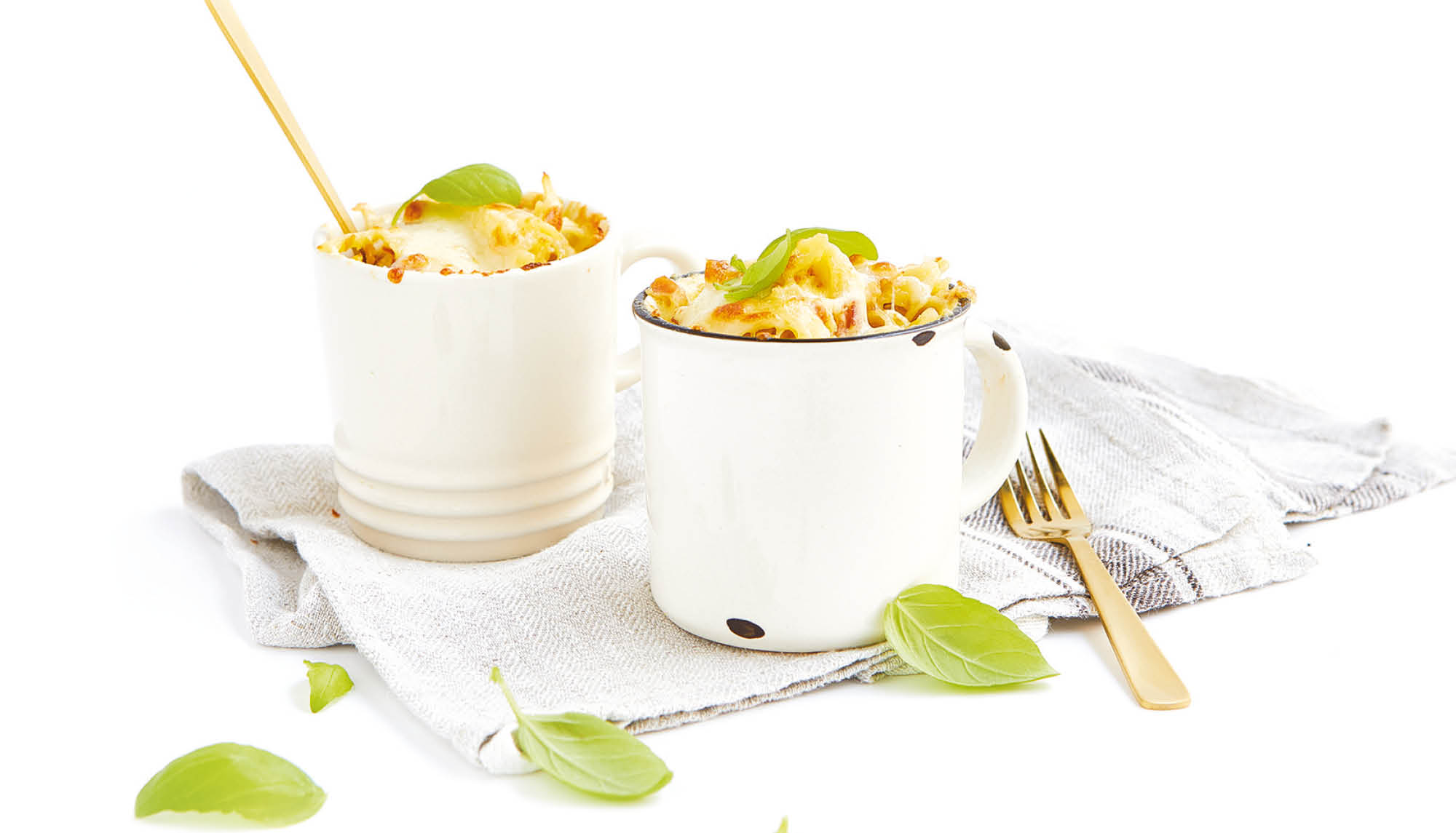 Distribua a massa em canecas ou taças pequenas, polvilhe com o queijo mozzarella e o restante presunto grosseiramente picado e leve ao forno durante 15 minutos ou até ficar dourado.