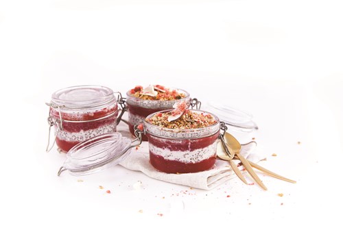 Coloque um pouco de doce em 8 frasquinhos. De seguida, divida o preparado para o pudim de chia e cubra-os com o restante doce. Leve ao frigorífico de um dia para o outro para ganhar consistência.