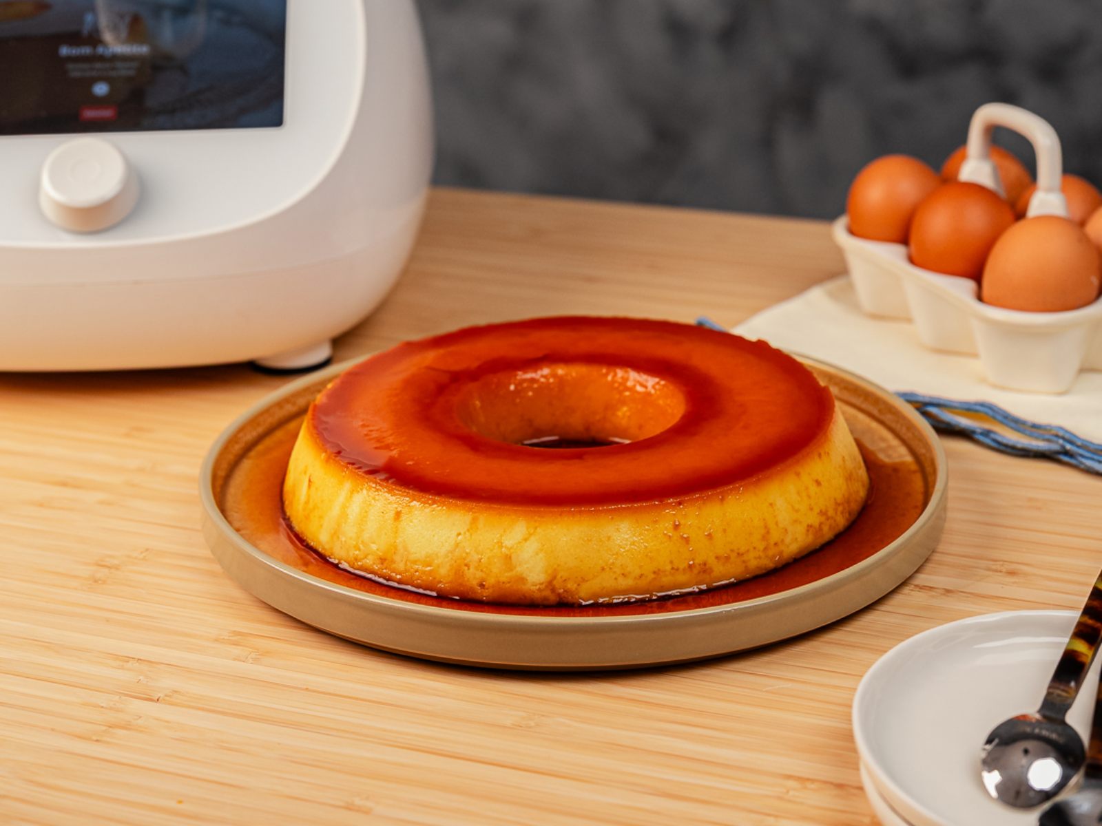 Verta o preparado na forma de pudim e leve ao forno, em banho‑maria, durante 35 minutos (se a forma de pudim for pequena, deixe cozer cerca de 40‑45 minutos).