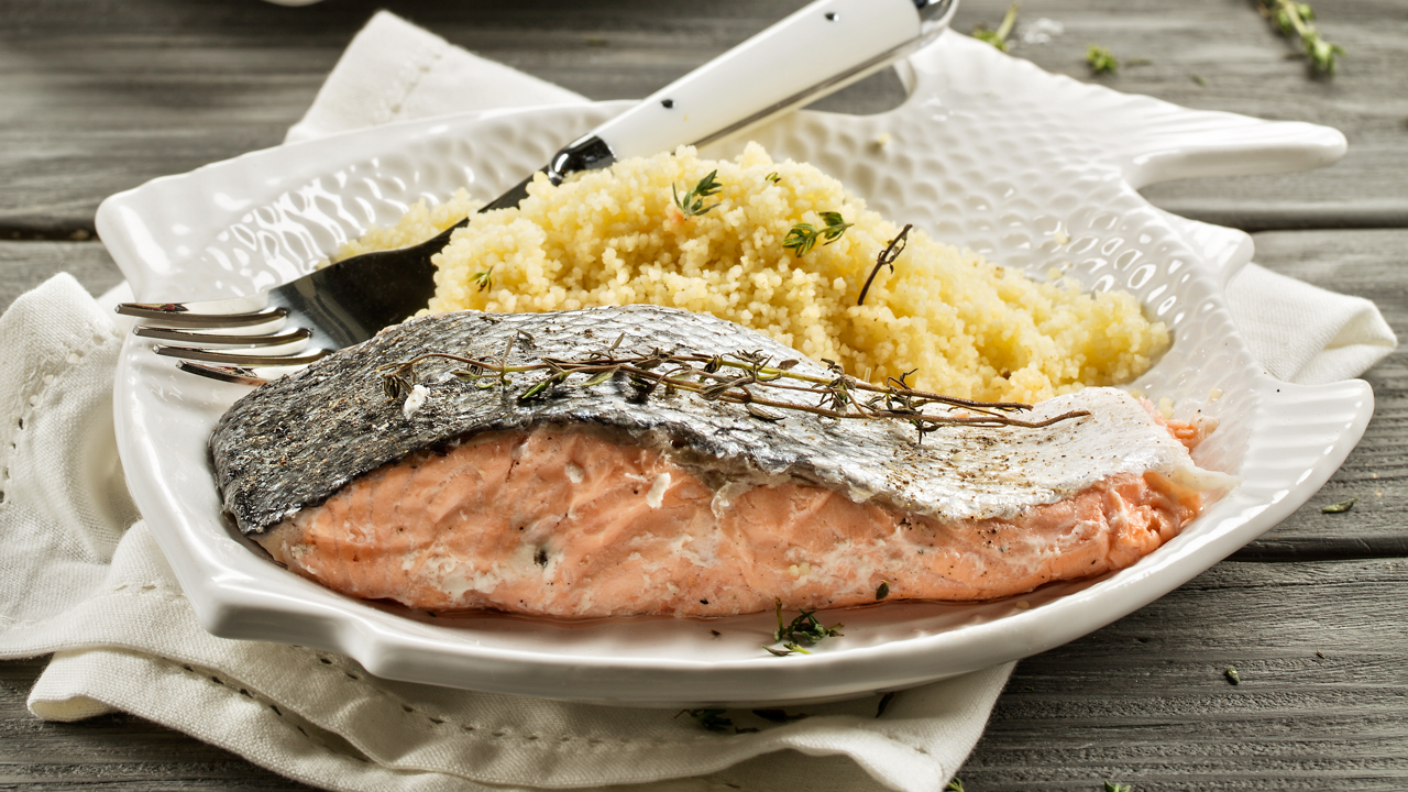 Deixe repousar 10 minutos. Sirva o salmão com o cuscuz de imediato.