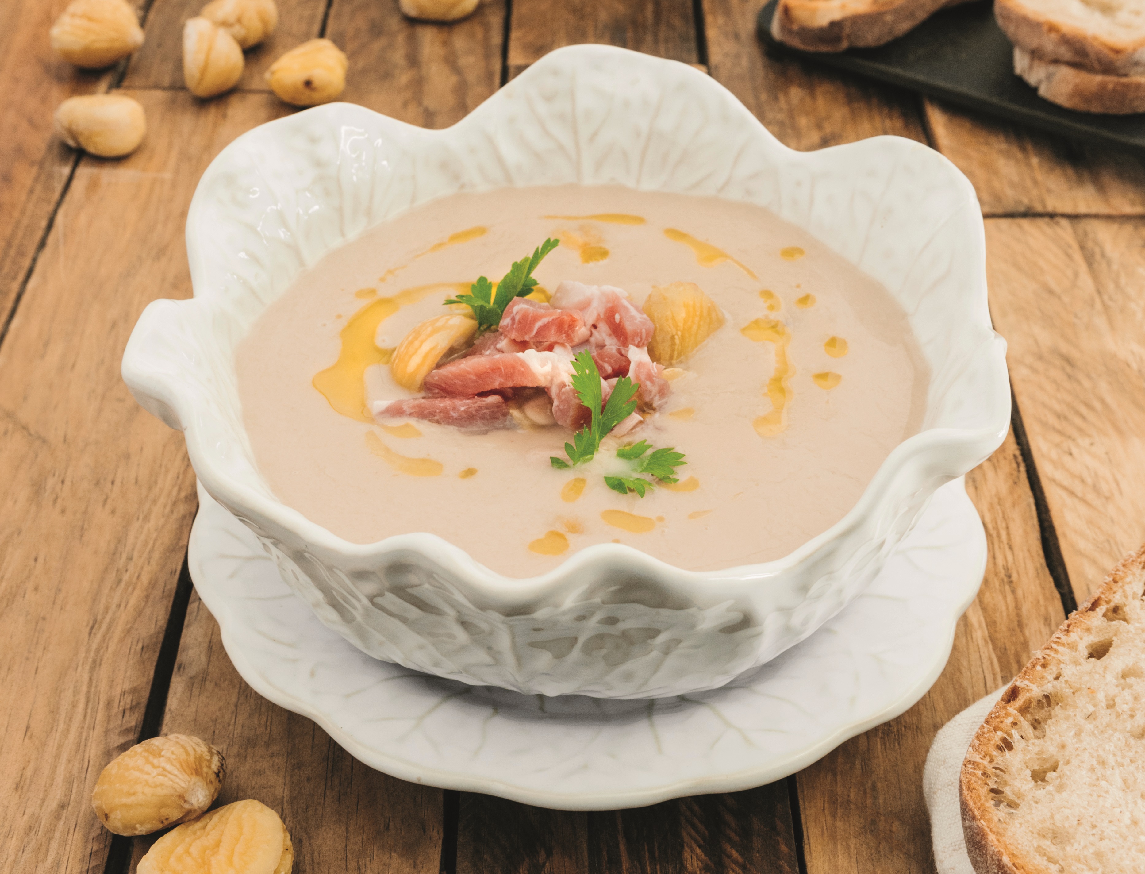 Sirva a sopa de castanha com cubinhos de presunto (opcional) e acompanhe com pão torrado.