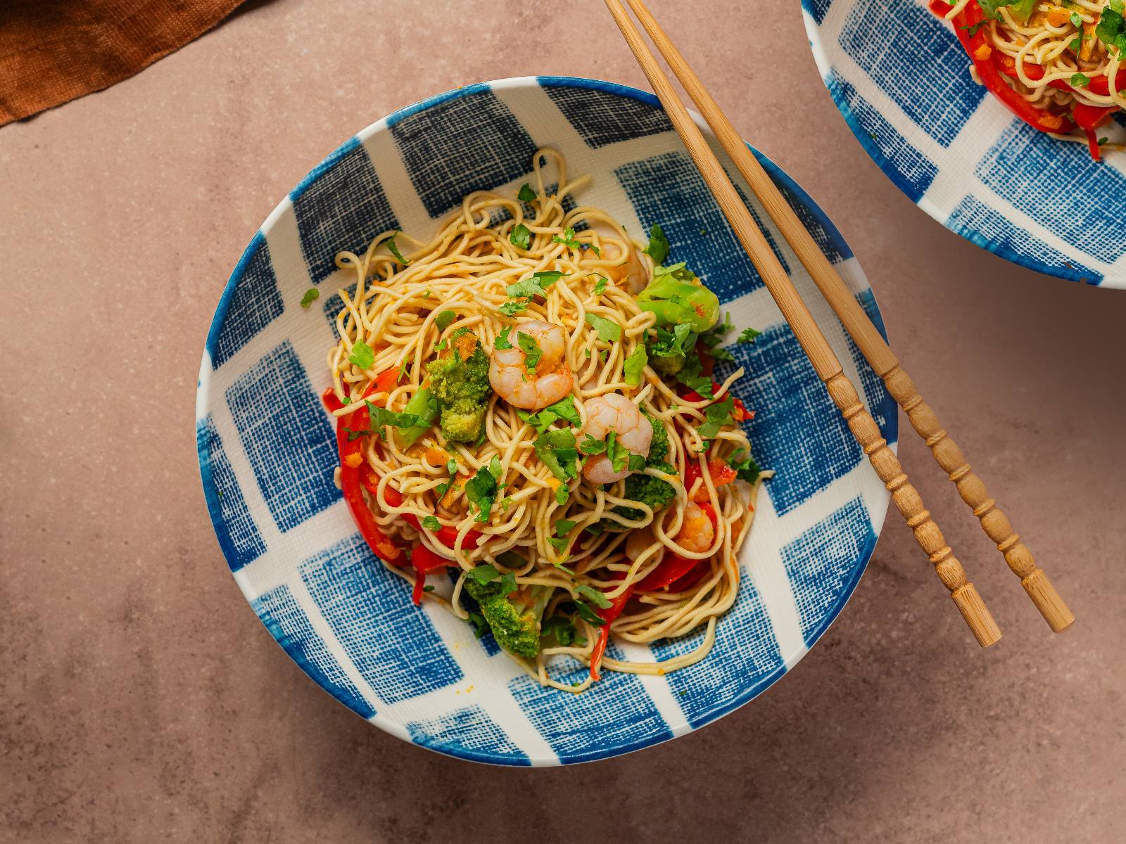 Noodles com Camarões e Legumes