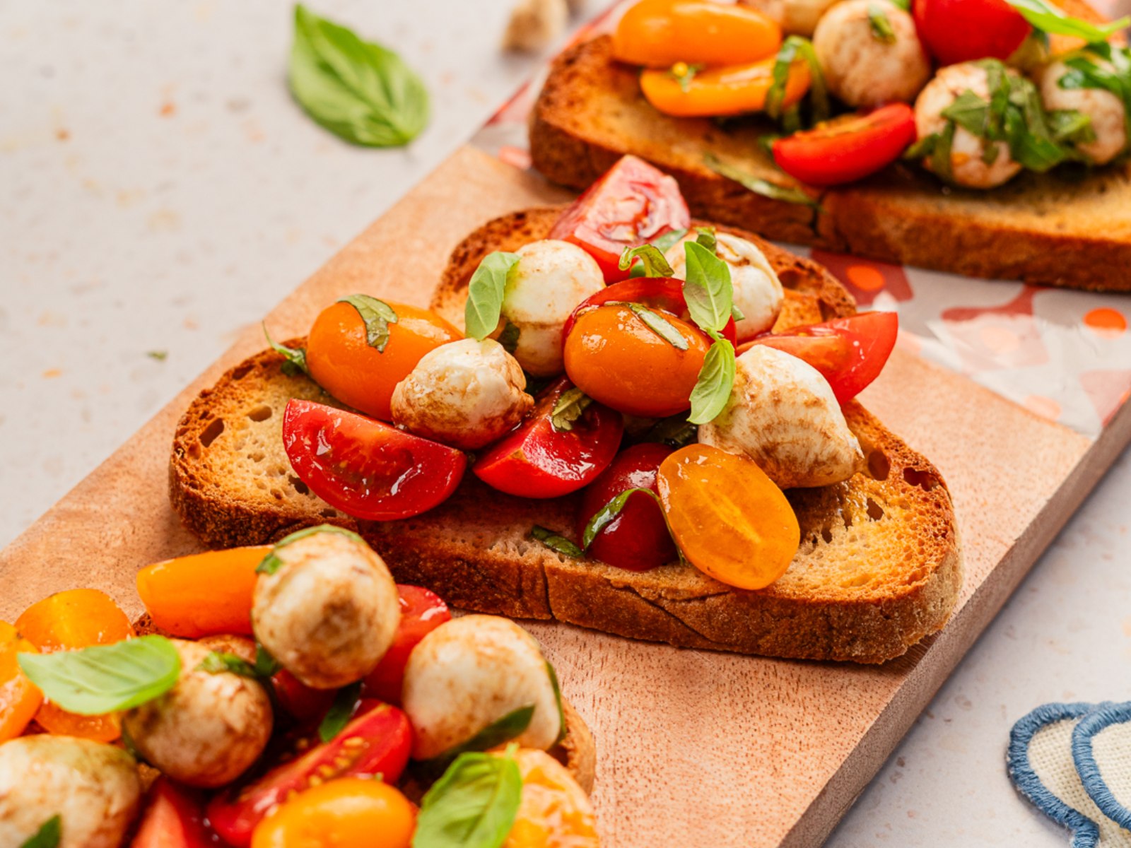 Bruschetta de Tomate-Cereja, Mozzarella e Manjericão